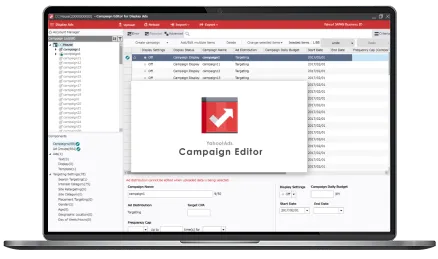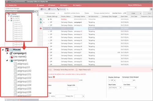 A tool for importing large amount of data “Campaign Editor” is now available on Display Ads! Campaigns, ad groups, ads, as well as images and Audience lists for site retargeting can be edited and imported offline.