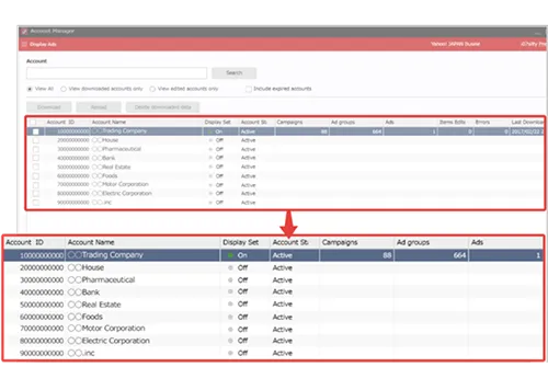 The account status can be confirmed from one screen using Campaign Editor. The number of campaigns and ads for each account will be displayed in a list.